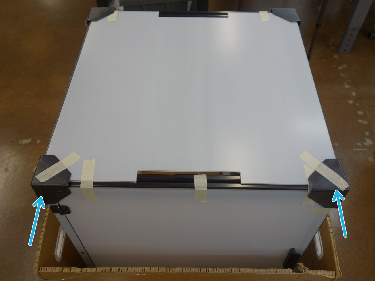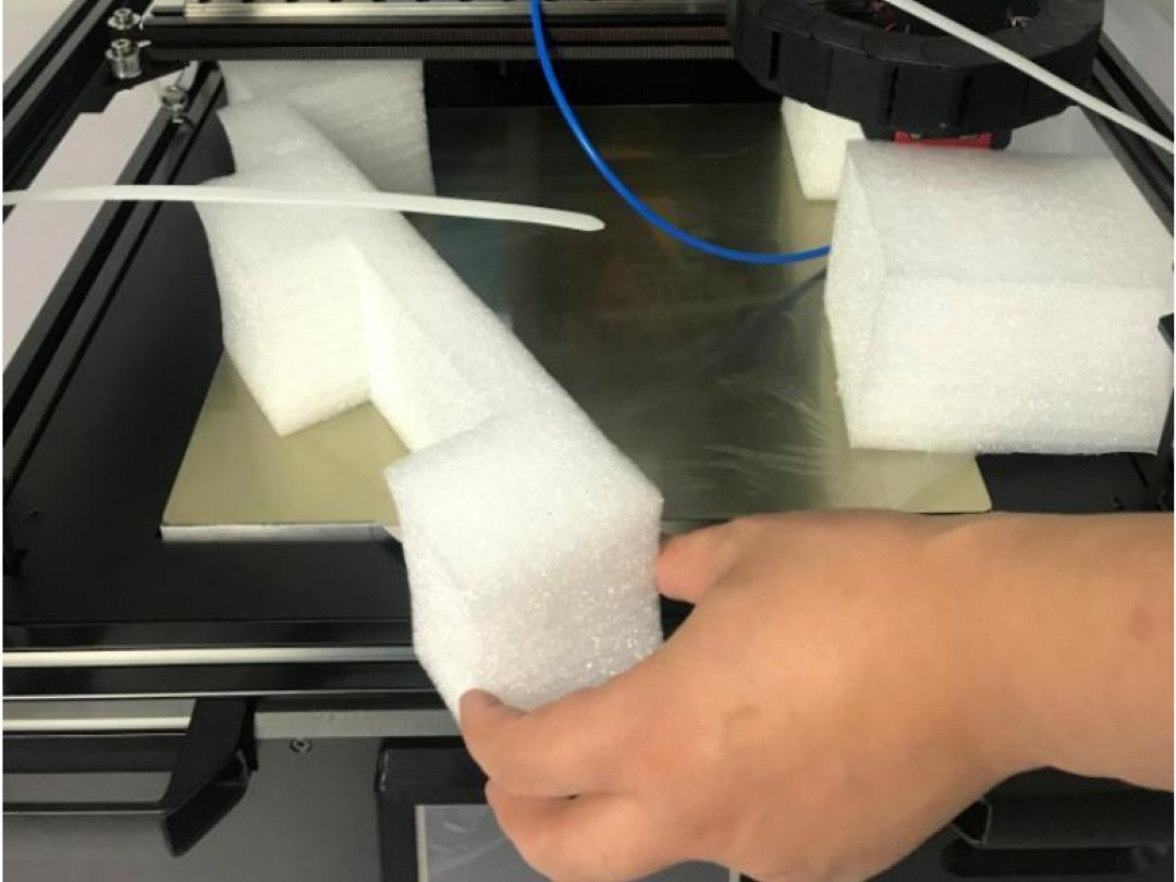 | Included handles mount on top, lining up with panel cut outs. | Smooth PEI will have a plastic film. Be sure to remove before printing. |
