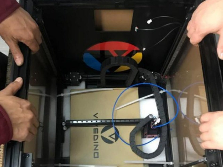 | Open the door then remove boxes (slide forward) | Remove foam while avoiding pulling on printhead | Cut cable ties, while avoiding belts and wires | Remove shipping tie down rings (twist CCW) |