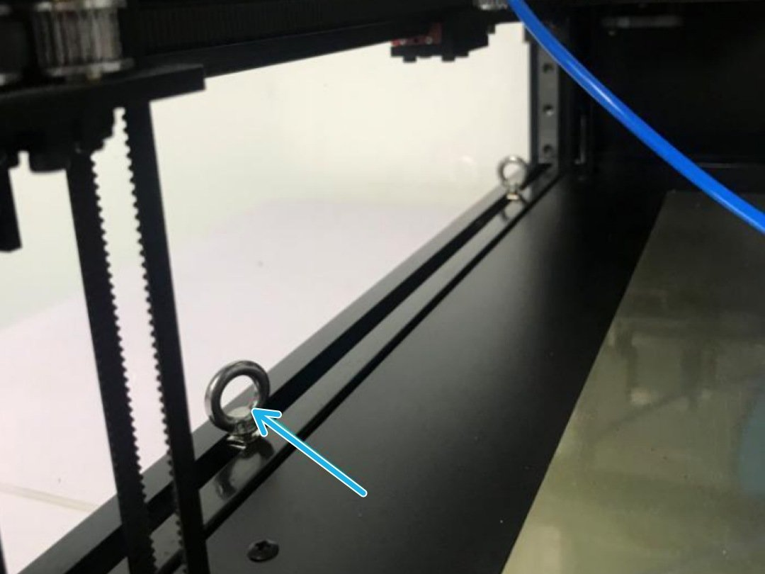 Below is how your machine is secured before going in the carton. The fan cable is taped to the rear panel, circled in red. Then, cable ties securing the gantry corners and drag chain, indicated with green arrows.