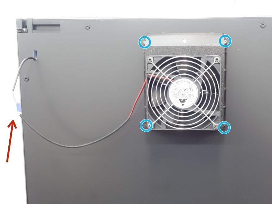 | Route the fan cable through the hole as shown | Mount fan with included M3 hardware and plug in |
