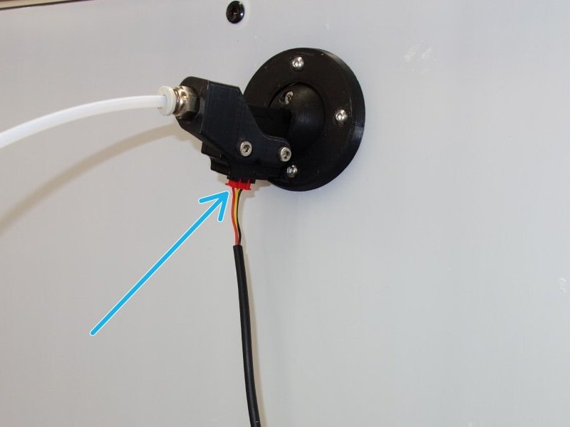 This sensor mounts outside the machine, close to the spool holder. The cable is taped to left side panel (1) for shipping and the sensor is shipped inside the parts box. We have designed and included a tubing adapter (4) attached and the sensor keys into the ball mount (2). The tubing goes halfway through the ball mount from the inside (3) and secures in the top of the extruder with integrated collets.