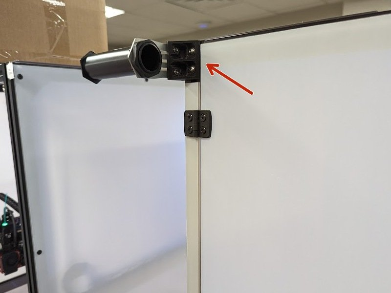 We have cut a section of the front door hinge mounting strip to mount the spool holder in the T-Slot extrusion. Slide the T-nuts in from the top and tighten the screws to secure the spool holder to the front of the printer. For Larger spools or for filament running in a dry box, we have included a tubing coupler.