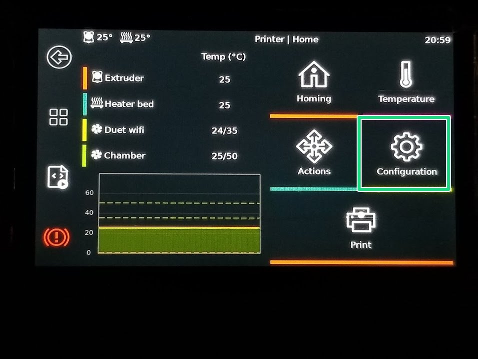 | back, back -->Configuration | -->Configuration/Z Calibrate | ~/Start -- machine will home again and position nozzle at 0 or pre-set offset position. |