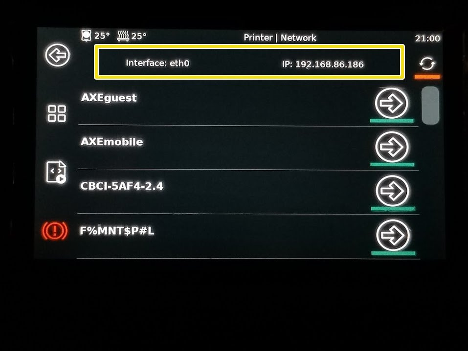 The Ethernet jack is visible from the right side of the machine. You connect directly to your router or switch and the IP address will show next to IPv4 / eth0 at top of network screen. Enter this IP into an internet browser on a device connected to the same network to pull up Mainsail.