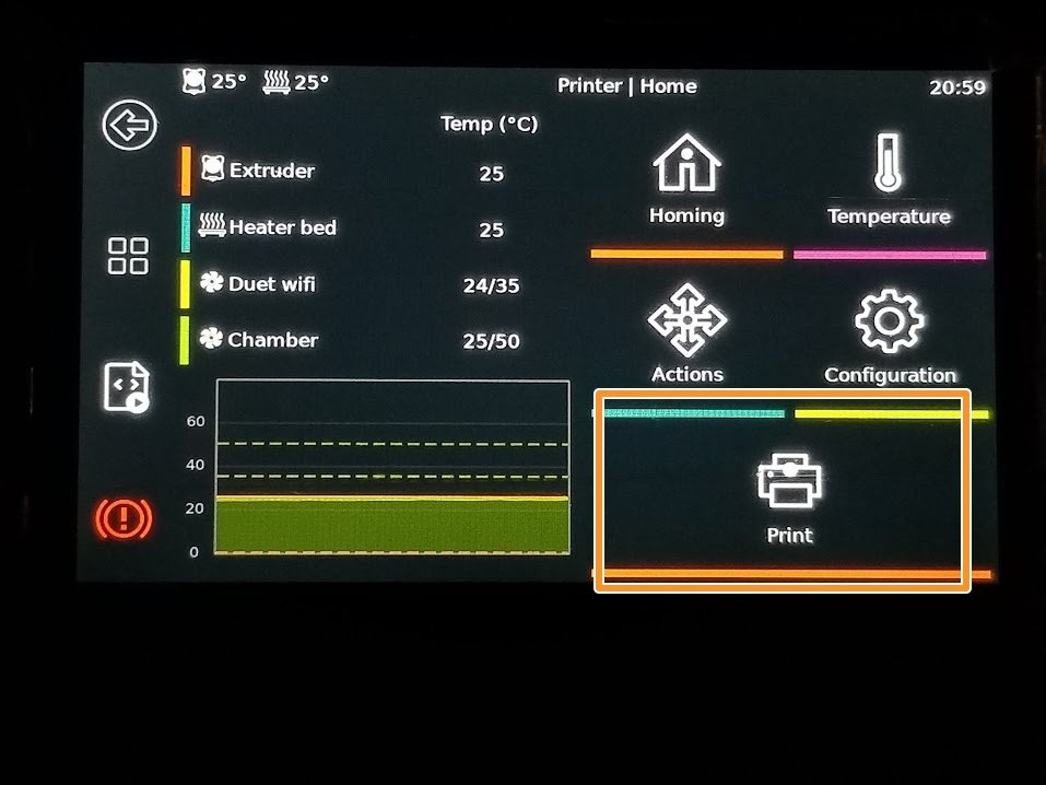 | Press Print | Select your .gcode file | Confirm by pressing print again | The printer will home and start preheating |