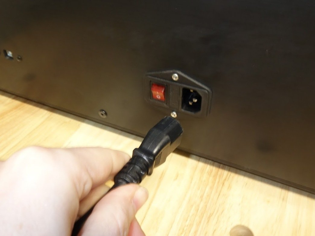 Using the supplied power cable, plug into a wall outlet. Power strips are OK but if running other devices on the same outlet, you may experience issues. This machine has an AC powered bed and uses up to 10amps peak.