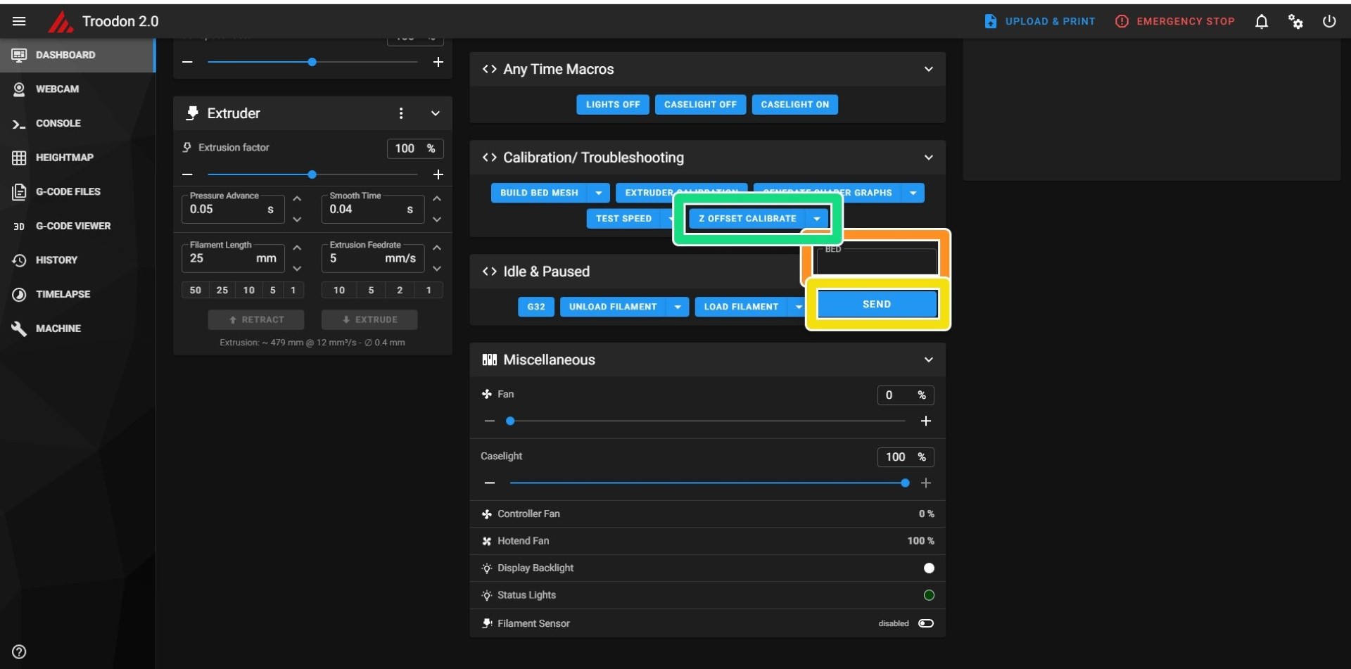 - Choose Z OFFSET CALIBRATE from the macros menu